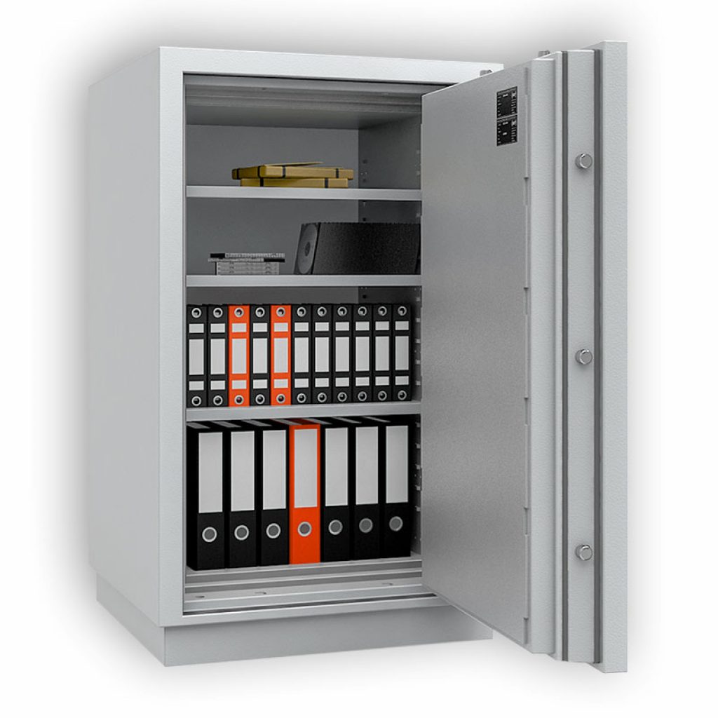 Wertschutztresor Müller Safe EN2-185 Dieser Wertschutzschrank, der in acht verschiedenen Größen verfügbar ist, überzeugt vor allem durch seine zertifizierten Sicherheitsstufe EN2, welche mit einer Feuerisolierung kombiniert wurde. Eine dreiseitige Bolzenverriegelung macht das Aufbrechen unmöglich und durch sein Gewicht kann dieser Tresor nicht abgetragen werden. In den verschiedenen Modellen finden fünf bis zu 52 Aktenordner Platz [...]